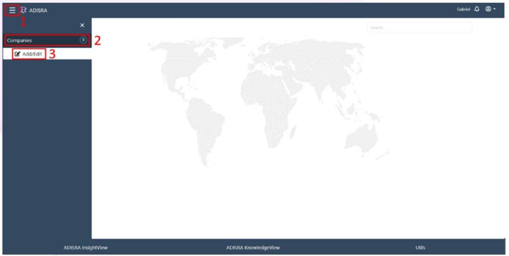 Click the navigation menu in the top-left corner of the page (1). When the menu opens, select the “Companies” tab (2), then click the “Add/Edit” button (3). Click the “+” button in the bottom-right corner of the page (4). A window will appear. Enter the company name (required), display name (the name shown in the navigation menu), and a short company description (5). When finished, click “Save.”