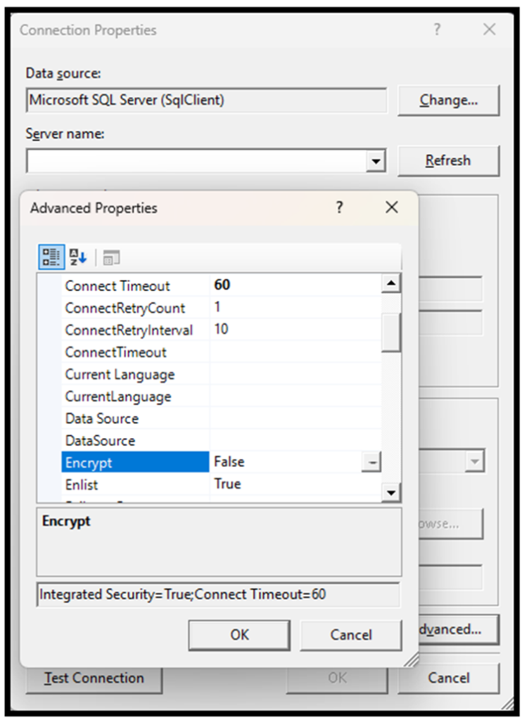 - TrustServerCertificate=true or TrustServerCertificate=false