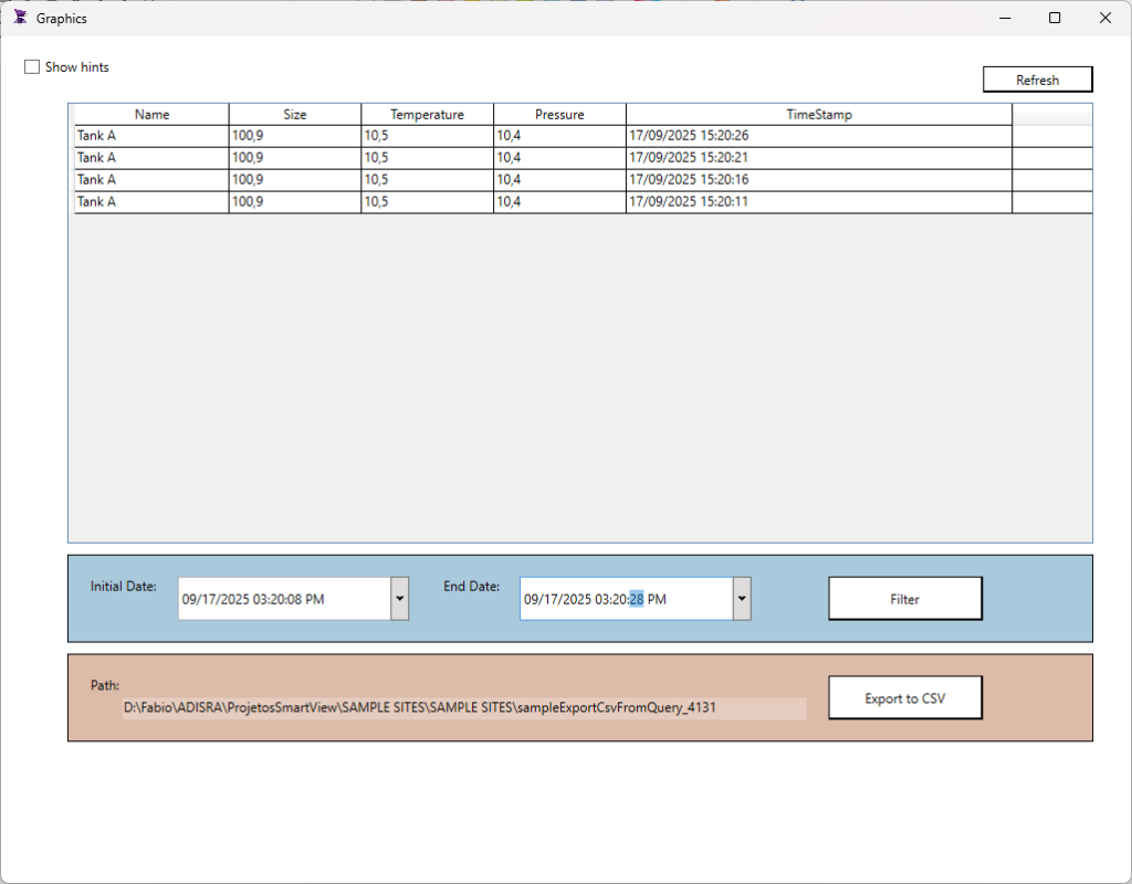 Description: This demo shows how to export the built-in stored alarm history. It provides a functionality to select a datetime range and export the alarm history into a csv format.