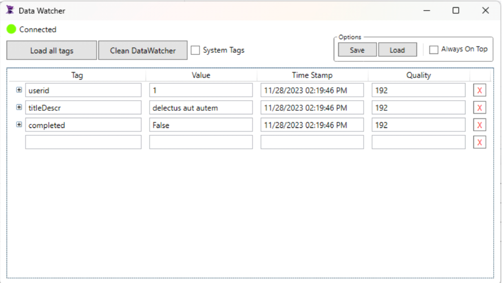 Save the driver document and run the application. Use DataWatcher to confirm that the tag values are correctly retrieved from the JSON response.